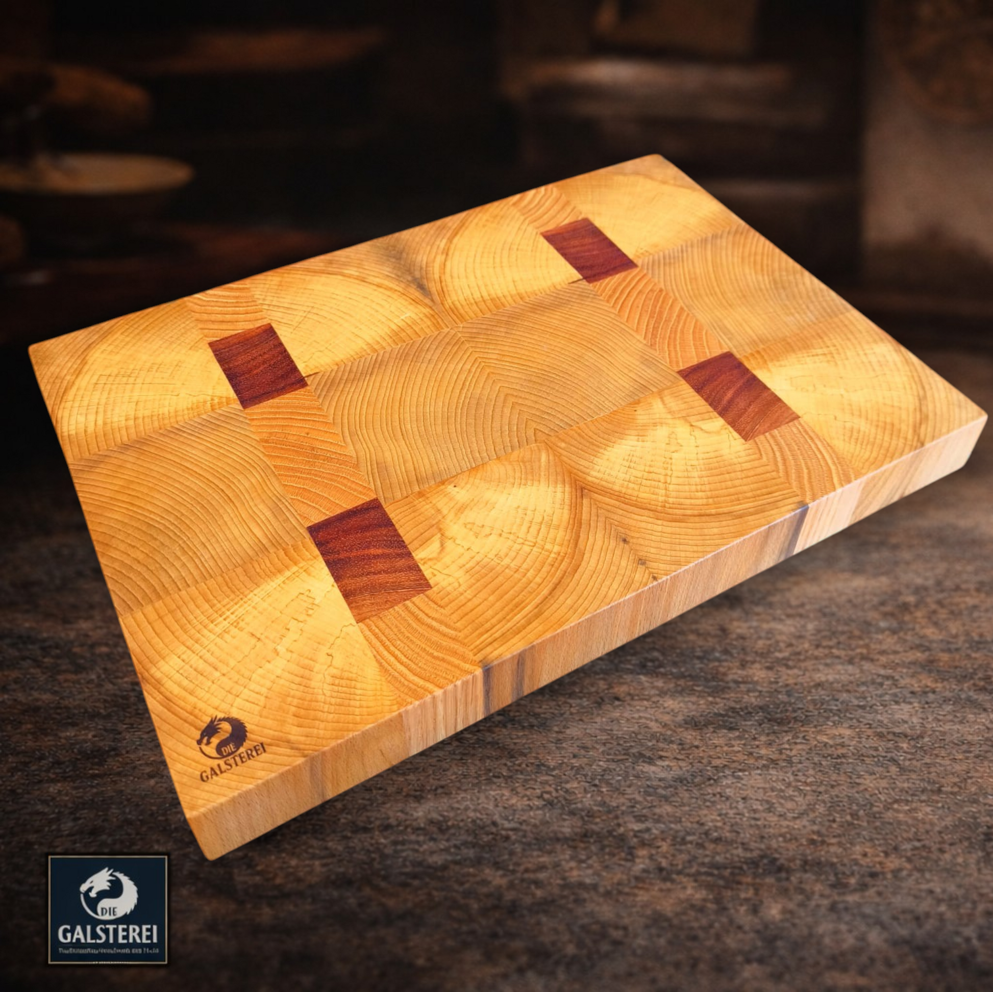 Die Galsterei fertig jedes Exemplar einzeln von Hand. Maße: 37,0 cm B x 25,8 cm L x 4,0 cm Höhe. Es vereint die Robustheit von Stirnholz mit der Eleganz von Edelholz, was es zu einem Highlight in jeder Kücheneinrichtung macht.