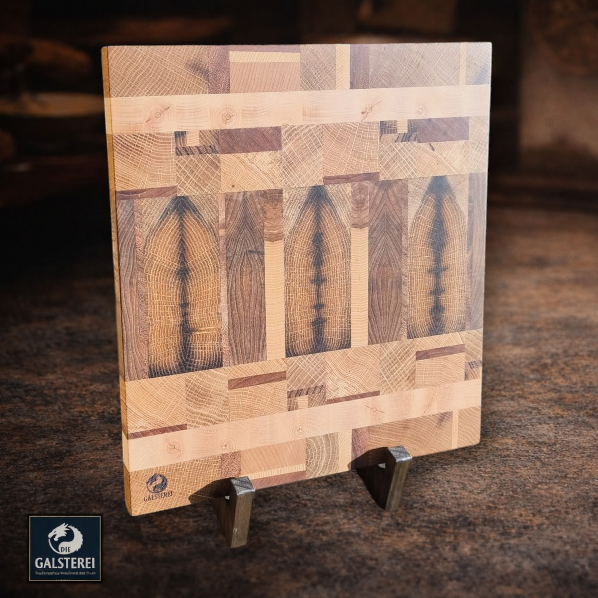 Dieses Edelholz Schneidebrett aus Stirnholz vereint Natürlichkeit, Handarbeit mit exklusiven Edelhölzern zu einem kleinen Kunstwerk. Ideal als Schneidbrett oder einzigartiges Wohnaccessoire. Größe 30,4cm × 33,4cm × 3,1cm.