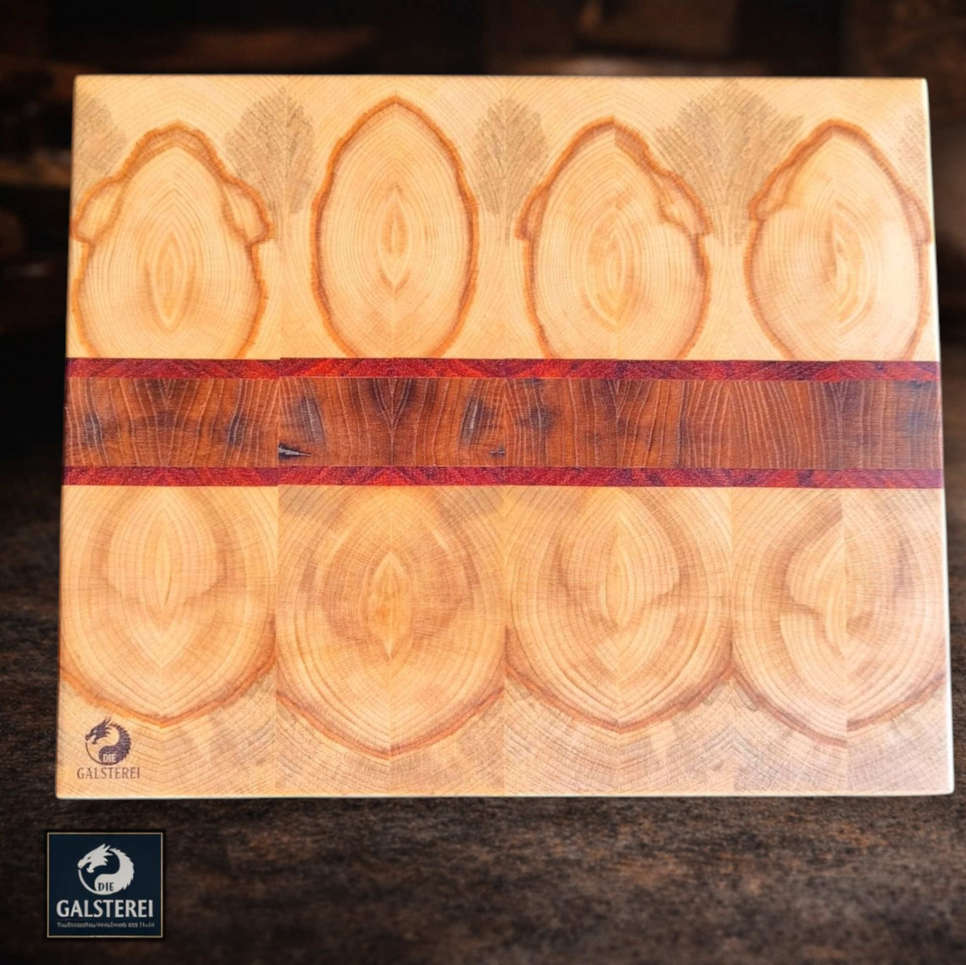 Die Galsterei fertig jedes Exemplar einzeln von Hand. Maße: 28,0 cm B x 23,0 cm L x 3,0 cm Höhe. Es vereint die Robustheit von Stirnholz mit der Eleganz von Edelholz, was es zu einem Highlight in jeder Kücheneinrichtung macht.
